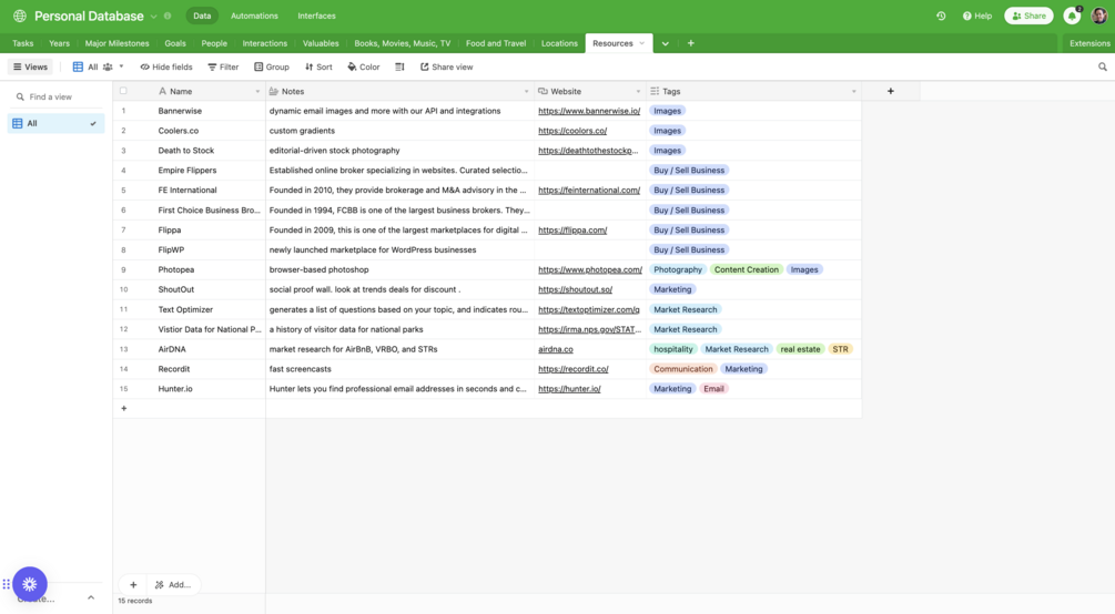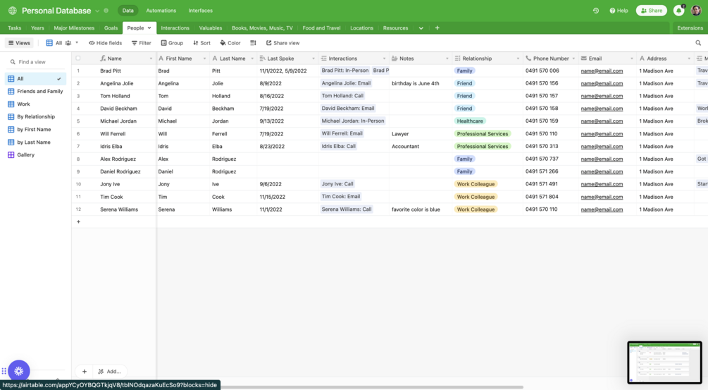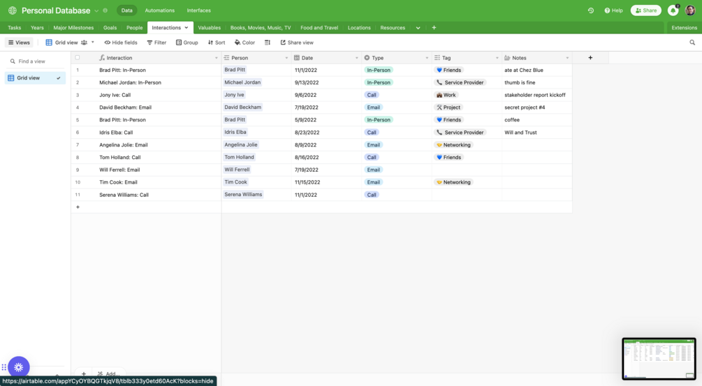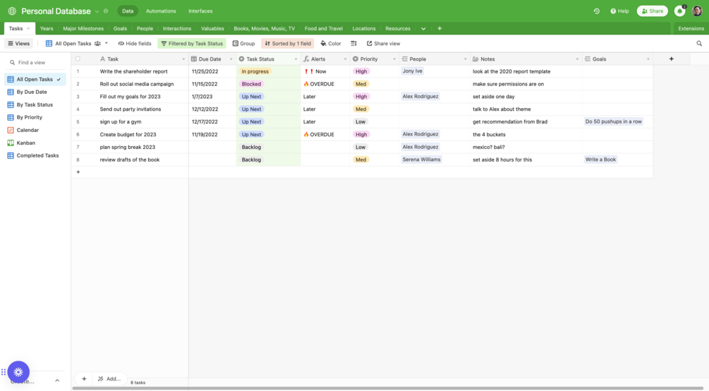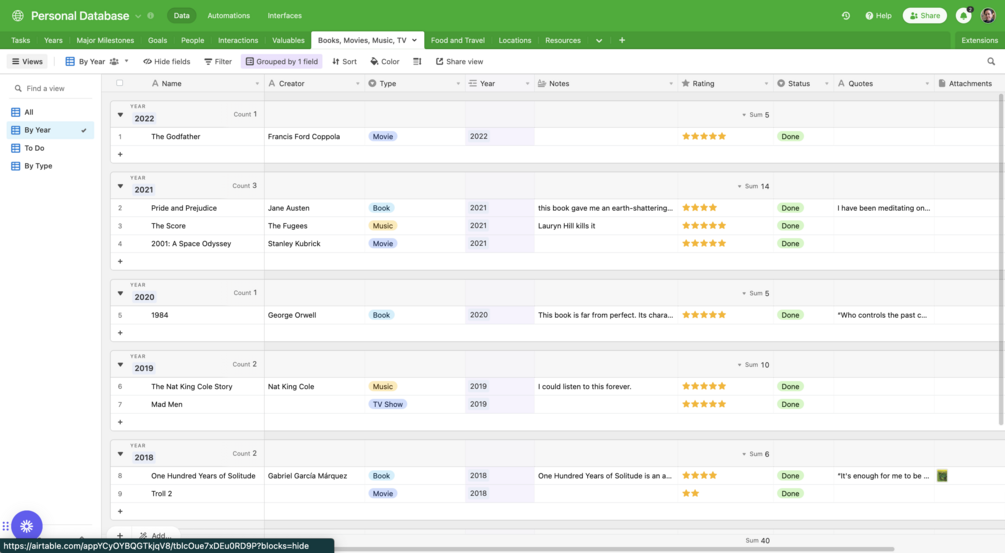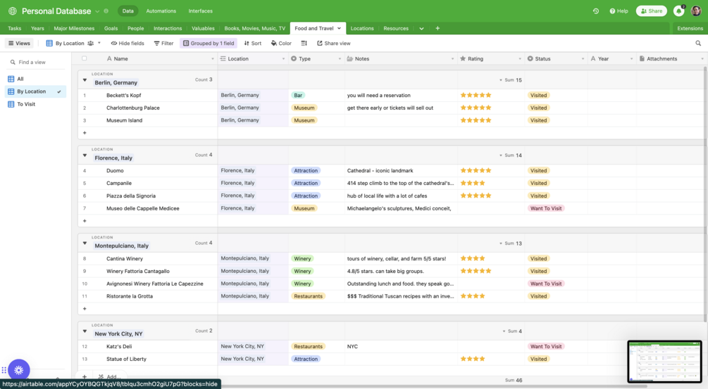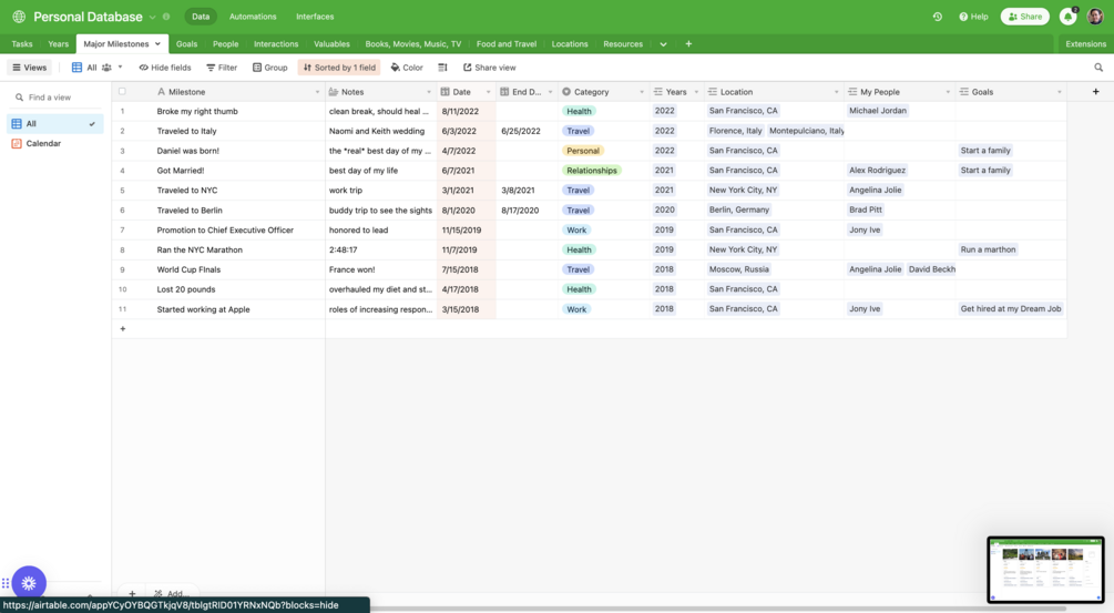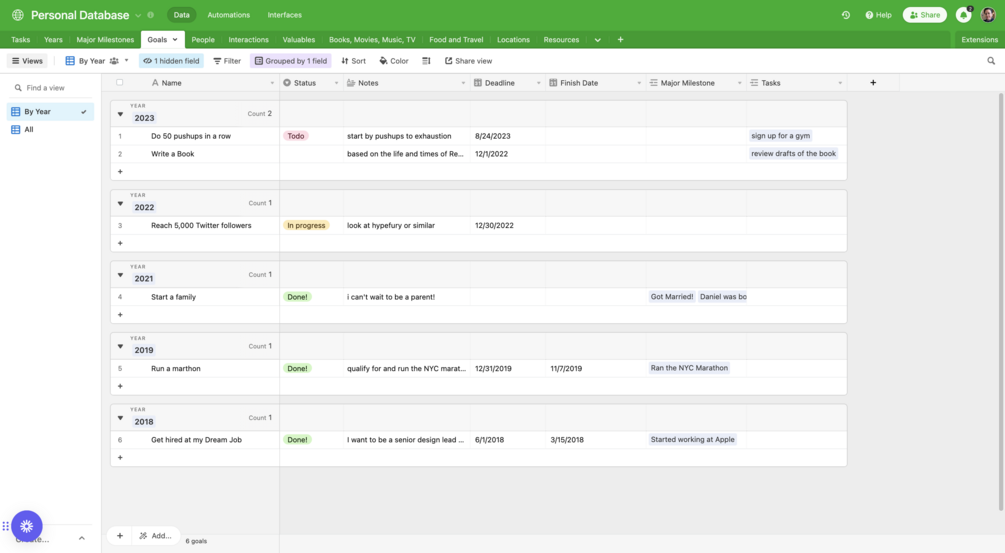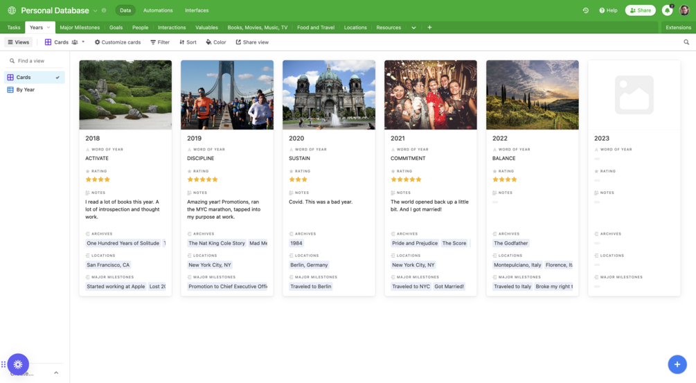 With a personal database, you can easily review your past and plan for your future with linked records across years, locations, milestones, and more.